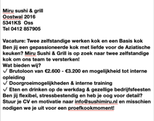 U kunt samen met familie, vrienden en collega’s genieten van ons eten. Vanuit ons menukaart kunt u kiezen voor vele dagverse sushi gerechten, teppanyaki gerechten, salade, soep en meer. Per ronde mag u p.p. 4 gerechten selecteren via de tablet die wordt geserveerd. Na afloop kunt u nog na genieten van ons dessert buffet met diverse soorten gebakjes, vers fruit, twee grote chocolade fonteinen en diverse soorten schepijs. Wij hopen u snel te zien bij Miru!