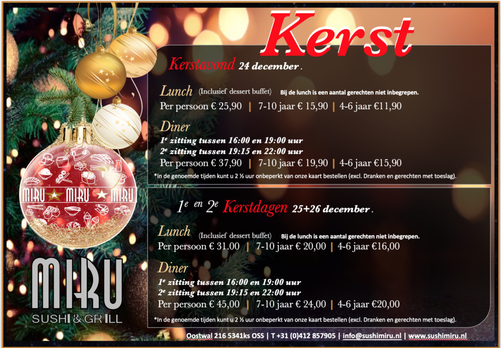 U kunt samen met familie, vrienden en collega’s genieten van ons eten. Vanuit ons menukaart kunt u kiezen voor vele dagverse sushi gerechten, teppanyaki gerechten, salade, soep en meer. Per ronde mag u p.p. 4 gerechten selecteren via de tablet die wordt geserveerd. Na afloop kunt u nog na genieten van ons dessert buffet met diverse soorten gebakjes, vers fruit, twee grote chocolade fonteinen en diverse soorten schepijs. Wij hopen u snel te zien bij Miru!